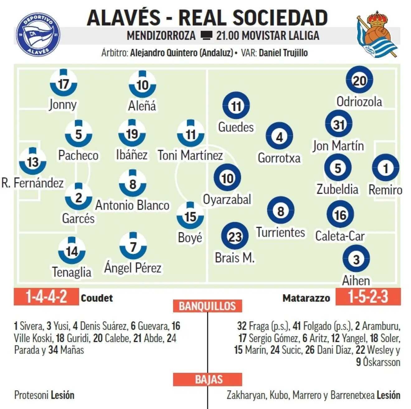 Como siempre, lo primero de todo es dejaros por aquí las alineaciones probables a esta hora de la tarde. Tiene toda la pinta que tanto Alavés como Real Sociedad saldrán con sus onces de gala, o muy próximos a ellos. La Copa ilusiona y su cómoda situación en Liga se lo permite a ambos.