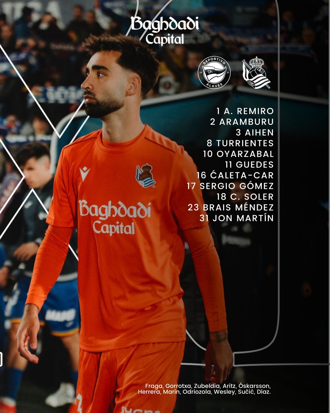 ¡Y tenemos once de la Real! Sale Matarazzo de inicio con Remiro, Aramburu, Jon Martín, Caleta-Car, Aihen, Turrientes, Soler, Brais Méndez, Guedes, Sergio Gómez y Oyarzabal.