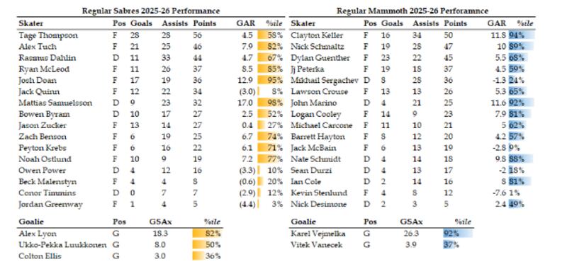 But sentiment around both teams was still relatively poor. Betting markets placed both teams below the playoff cut line, likely owing to two factors: a recent history of underperformance, and relatively young lineups. The Sabres (25.7) and Mammoth (27.8) have two of the younger lineups in the NHL, which is typical for franchises that have been actively rebuilding and pushing young talent up through the ranks.