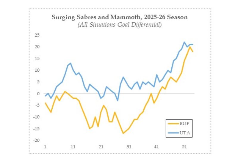 But that young talent has positioned both teams for likely playoff qualification as we veer into February. The Sabres are around 70 per cent likely to qualify, the Mammoth an even more impressive 83 per cent.
