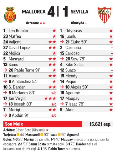 Petardazo del Sevilla en Mallorca. Derrota incontestable de los andaluces ante el conjunto bermellón, que sale del descenso alumbrado por el talento de Virgili y su fortaleza en Son Moix -19 puntos como local-. El tanto del debutante Neal Maupay dio esperanza a los hispalenses, pero apenas fue un espejismo antes de caer en los vicios de siempre, errores propios, falta de calidad y los cambios tampoco ayudaron. El equipo tiene un problema atrás. Qué larga se le va a hacer la temporada al aficionado sevillista...